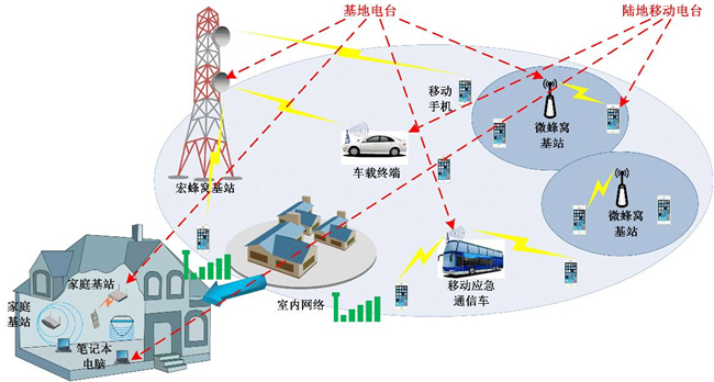 蜂窝移动通信系统是证实上述对应关系最好的例证。如图4所示,2G时代GSM、3G时代TD-SCSMA/WCDMA/CDMA-2000、到4G时代TD-LTE/LTE FDD,这些蜂窝网络承载的无线电业务都是陆地移动业务。网络中的宏蜂窝基站(Macro BS)、微蜂窝基站(Micro BS)、微微蜂窝基站(Pico BS)、家庭基站(Femto BS)、移动应急通信车等一般部署在楼顶、广场、街边等固定位置的无线电台都属于陆地电台范畴中的基地电台;网络中的个人移动终端(如手机)、笔记本电脑、车载终端等供人们在移动中使用的无线电台都属于移动电台范畴中的陆地移动电台。船舶电台和海岸电台、以及航空器电台和航空电台之间的关系亦是如此。